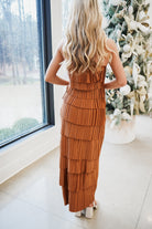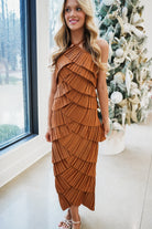 Turn heads in the Dia Midi Dress, where dramatic flair meets effortless elegance. This sleeveless halter beauty features an accordion-pleated ruffle design that creates stunning dimension through layered textures, all sculpted into a flattering diamond silhouette. The open back with adjustable neck tie closure adds an unexpected touch of allure and freedom of movement. Perfect for making a statement at any occasion—whether you're dancing the night away or commanding attention at a special event!