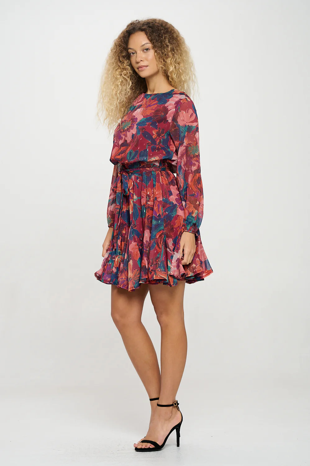 Make a statement with this vibrant floral mini dress, perfect for adding a pop of color to your wardrobe. Featuring a striking floral pattern, this dress is designed with long sleeves and a round neckline, offering a balanced blend of elegance and boldness. The adjustable belt at the waist enhances the silhouette, creating a flattering fit that flows into a playful skirt. Ideal for daytime outings or evening occasions, pair it with boots for a trendy look or heels for a more polished style. This dress is sure to turn heads wherever you go!