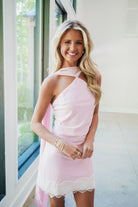 Slip into effortless elegance with the Esme Mini Dress. This stunning piece features a pink satin bodice with a graceful halter neckline and dramatic draped sash that flows down the back. The sleeveless silhouette showcases an alluring open back design, while the mini skirt is finished with delicate white embroidered lace detailing. Perfect for cocktail events, date nights, or any occasion calling for sophisticated style.
