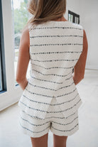 Step out in style with the Ivey Set — a playful twist on classic chic. Featuring a tweed textured and stripe-printed two-piece, this set includes a sleeveless vest with loop buttons and a handy front pocket. The matching boxy shorts come with side pockets, blending comfort and cool for your everyday adventures. Perfect for mixing, matching, or making a statement!