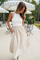Get ready to shine in the Jane Maxi Dress, featuring a crisp white sleeveless tank top with a fun black contrast trim around the round neck. Paired with a flowing long beige maxi skirt, this look is effortlessly chic and perfect for playful days and breezy evenings.