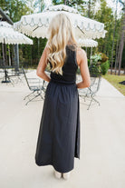 Get ready to shine in the Jane Maxi Dress, featuring a crisp black sleeveless tank top with a fun whit' contrast trim around the round neck. Paired with a flowing long black maxi skirt, this look is effortlessly chic and perfect for playful days and breezy evenings.