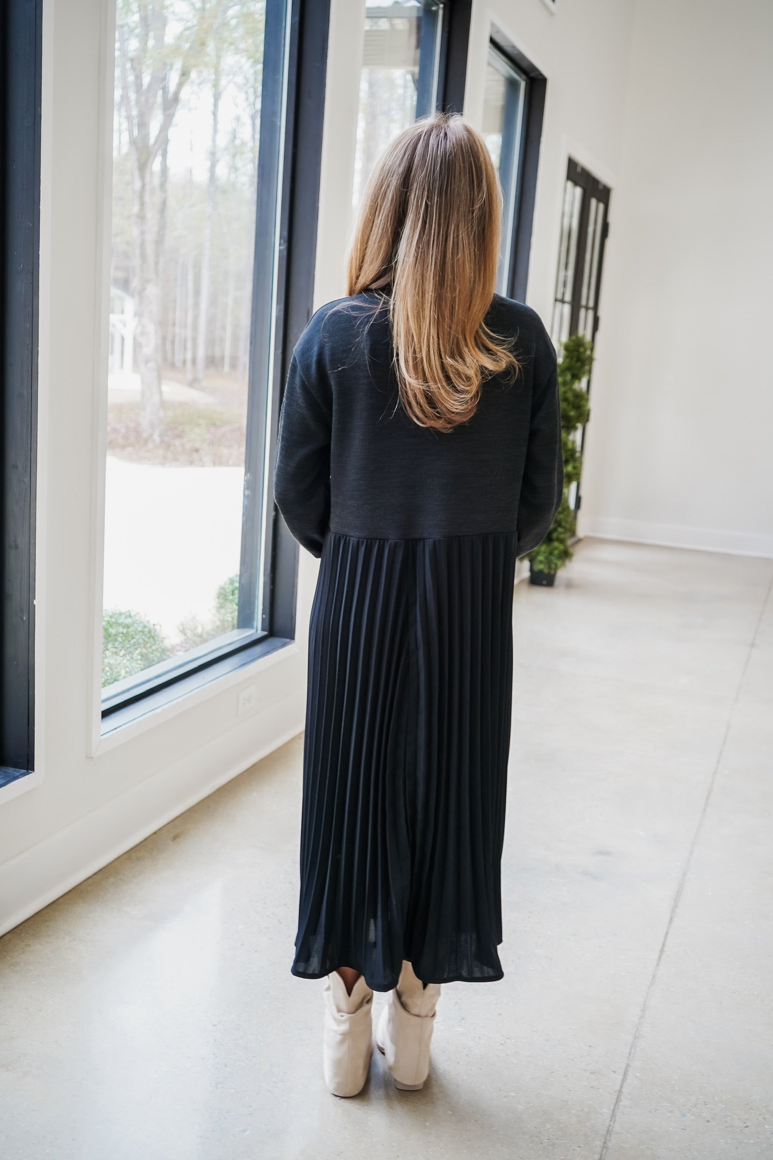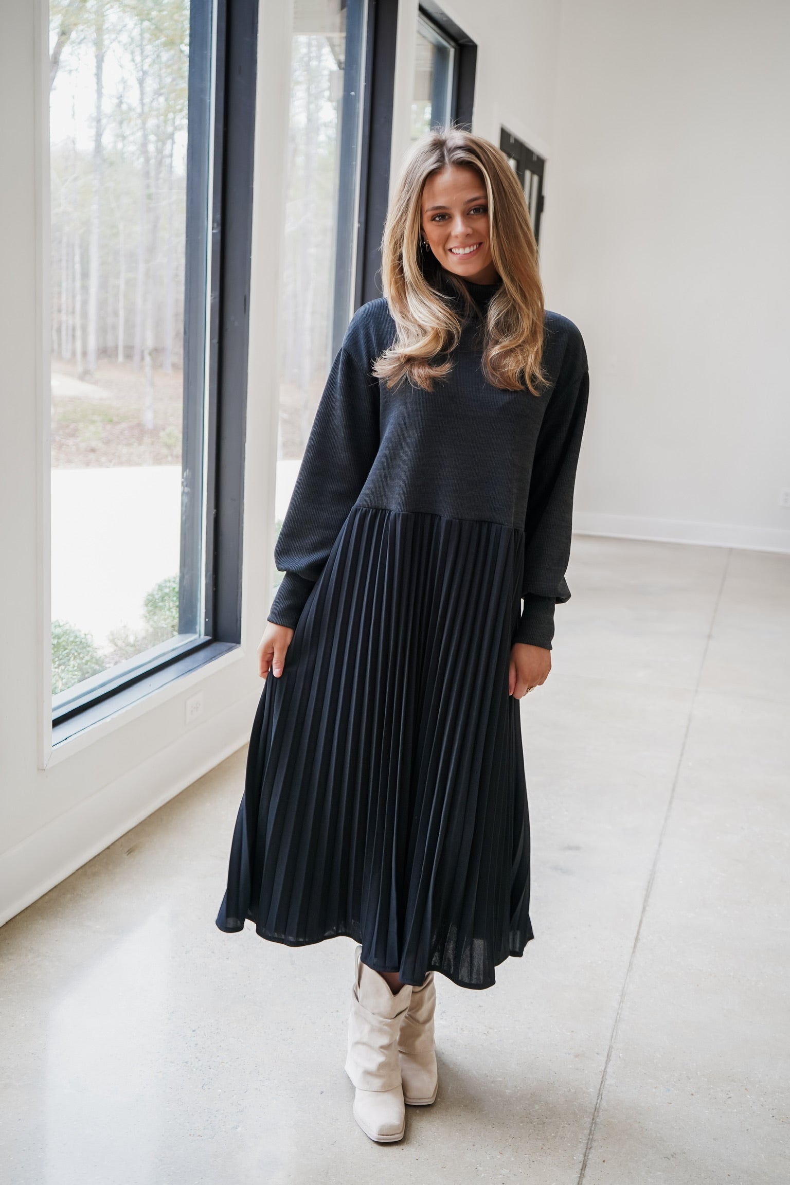 Slip into effortless elegance with the Jen Midi Dress in classic black. This playful piece features a mock turtleneck and long cuffed sleeves for a chic, layered look. The accordion pleated midi skirt adds movement and dimension, while mixed media fabric details elevate the design with unexpected texture. Perfect for transitioning from day to night with understated sophistication and a touch of modern flair.