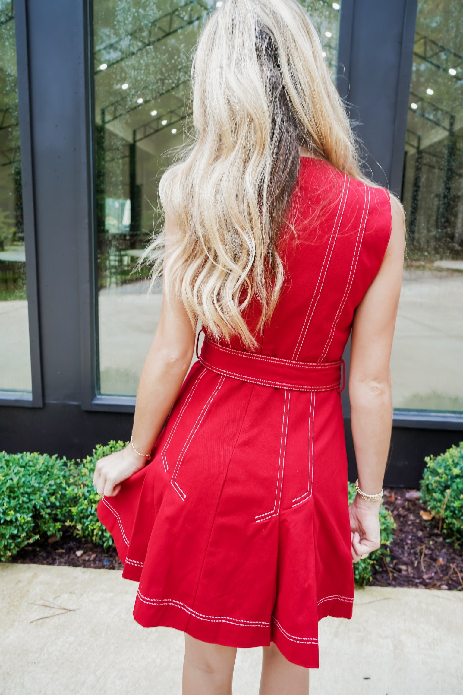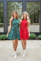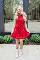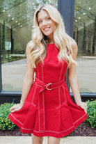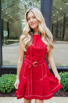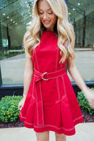 Turn heads in the Jillian Mini Dress! Featuring playful contrast top stitching and charming front pleats, this sleeveless dress brings flair to your look. The matching belted waistline accentuates your figure, while the polished tailored silhouette offers a sleek finish. With a back hidden closure, it’s as convenient as it is stylish—perfect for dancing the night away or stepping out with confidence.