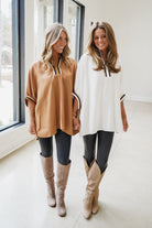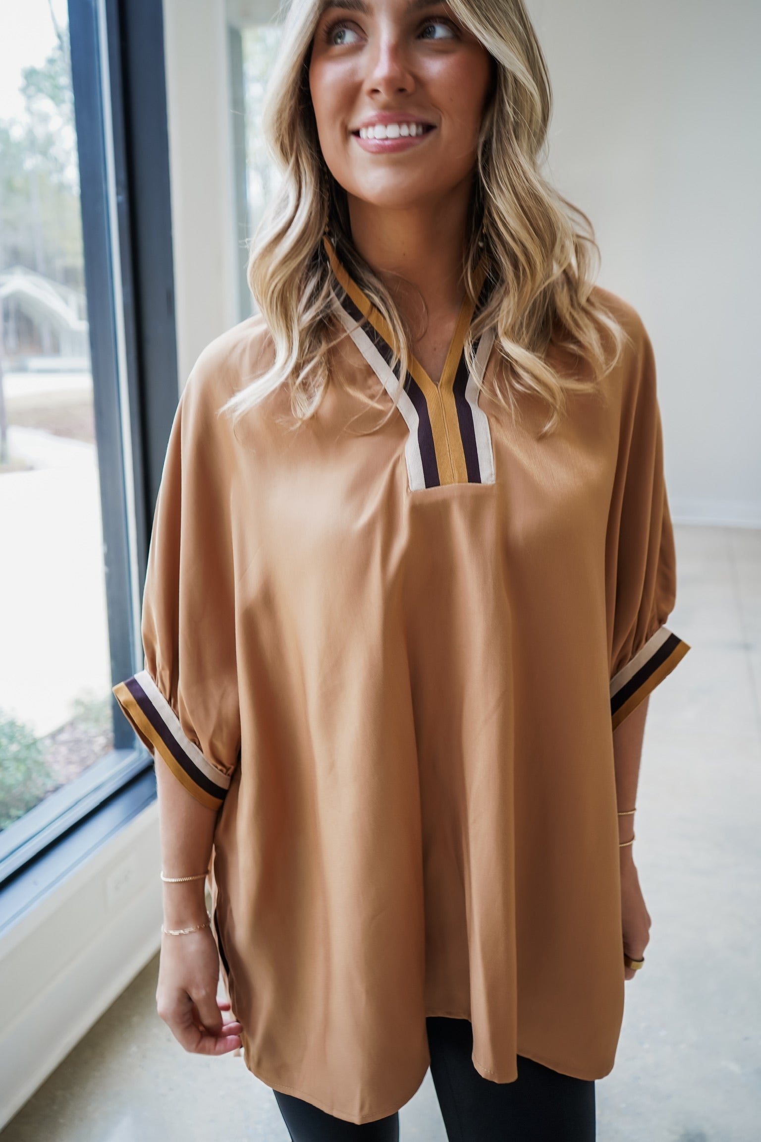Effortlessly chic, the Jordy Top brings laid-back vibes with its split v-neckline and contrast stripe detailing at the sleeves and neckline. The oversized silhouette drapes beautifully for all-day comfort, making it your go-to piece for casual styling. Pair it with your favorite jeans or dress it up for a relaxed weekend look.