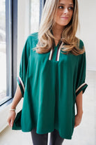 Effortlessly chic, the Jordy Top brings laid-back vibes with its split v-neckline and contrast stripe detailing at the sleeves and neckline. The oversized silhouette drapes beautifully for all-day comfort, making it your go-to piece for casual styling. Pair it with your favorite jeans or dress it up for a relaxed weekend look.