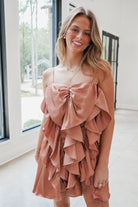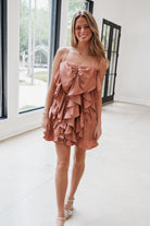 Turn heads in the Julianne Mini Dress, crafted from silky rosewood pink satin. This playful design features thin adjustable straps and a charming bow bodice, while vertical ruffles add flirty texture. The open back with a discreet zipper keeps the look effortlessly chic, perfect for dancing the night away or stealing the spotlight. Easy to wear and impossible to ignore.
