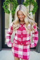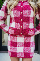 Get cozy and chic with the Karly Set, featuring a red and white plaid fuzzy sweater cardigan topped with shiny gold buttons. Paired perfectly with a matching mini skirt, this playful duo adds fun flair to your wardrobe while keeping you warm and stylish. Ideal for turning heads wherever you go!