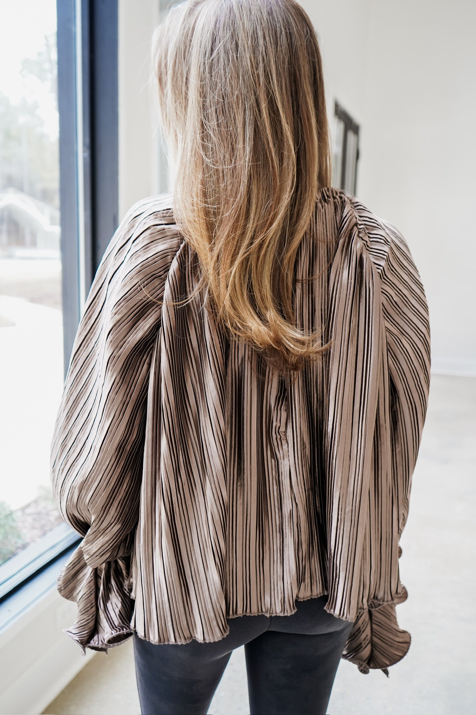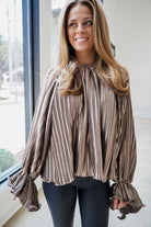 Elevate your wardrobe with the Koda Top, a statement piece that combines texture and drama. This long sleeve blouse features accordion pleating and subtle ribbing throughout, creating visual depth and dimension. The showstopping balloon sleeves add an effortless sense of sophistication, while delicate ruffled cuffs frame the wrists beautifully. A stretchy elastic neckline ensures a comfortable, flattering fit all day long. Perfect for transitioning from office to evening, this versatile top pairs seamlessly with tailored trousers or your favorite jeans.
