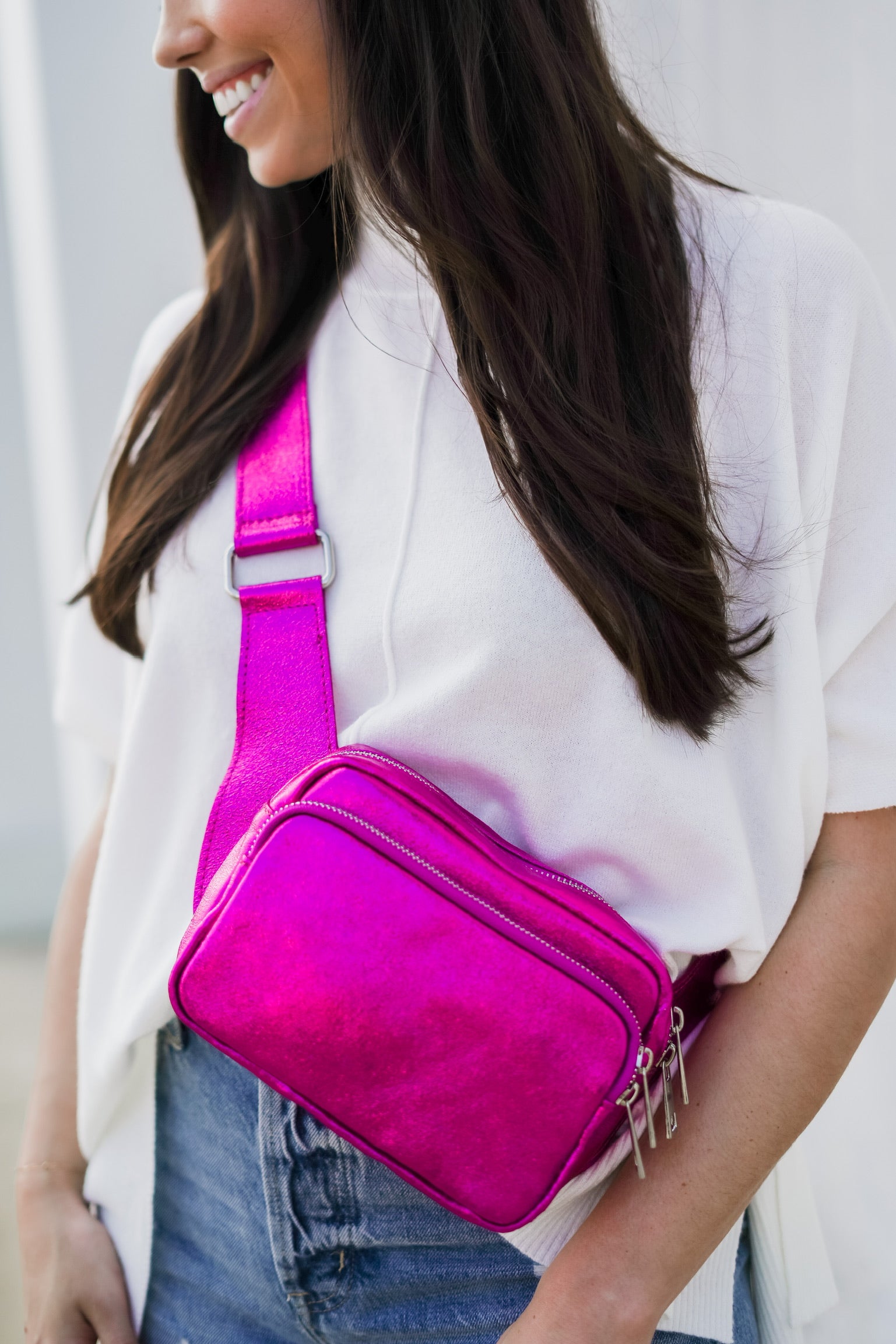 Complete your look with this fuchsia faux leather crossbody bag! Adjustable strap with large main compartment + outside zipper pocket.