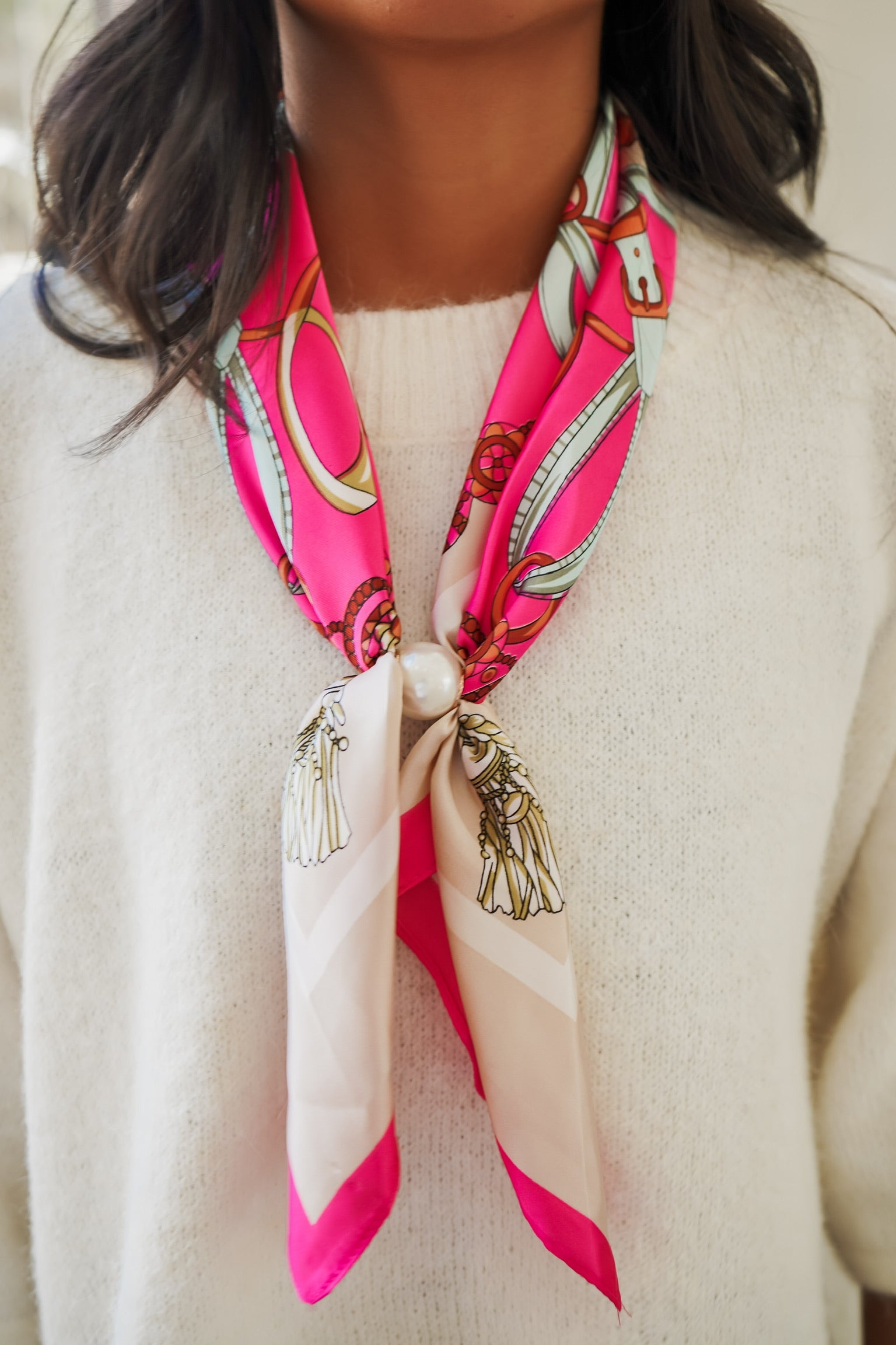Elevate your accessory collection with this sophisticated long satin scarf necklace, featuring an elegant printed design that transitions seamlessly from day to evening wear. The piece is adorned with a lustrous white pearl ball detail that adds refined dimension and visual interest. Designed for effortless styling, the magnetic closure ensures secure fastening while allowing quick adjustments throughout your day. The luxurious satin fabric drapes beautifully, making this versatile accessory the perfect complement to any wardrobe!