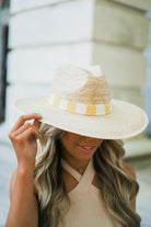 The Maggie hat features a cotton woven band with bold, electric yellow and white stripes. Each one is handmade from palm fronds of the banks of the Chixoy River by our Guatemala female artisans.