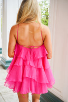Get ready to make a statement with our Marina Mini Dress! This sleeveless mini dress features a halter style neckline with a delicate rose detail and tiered ruffle layers. The open back with strappy tie closure adds a playful touch. Perfect for any occasion!
