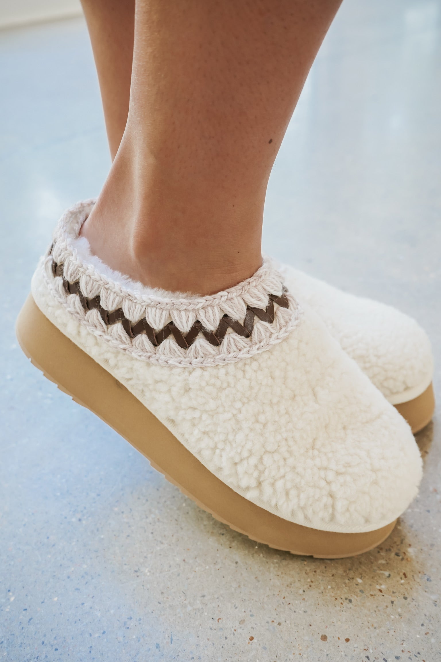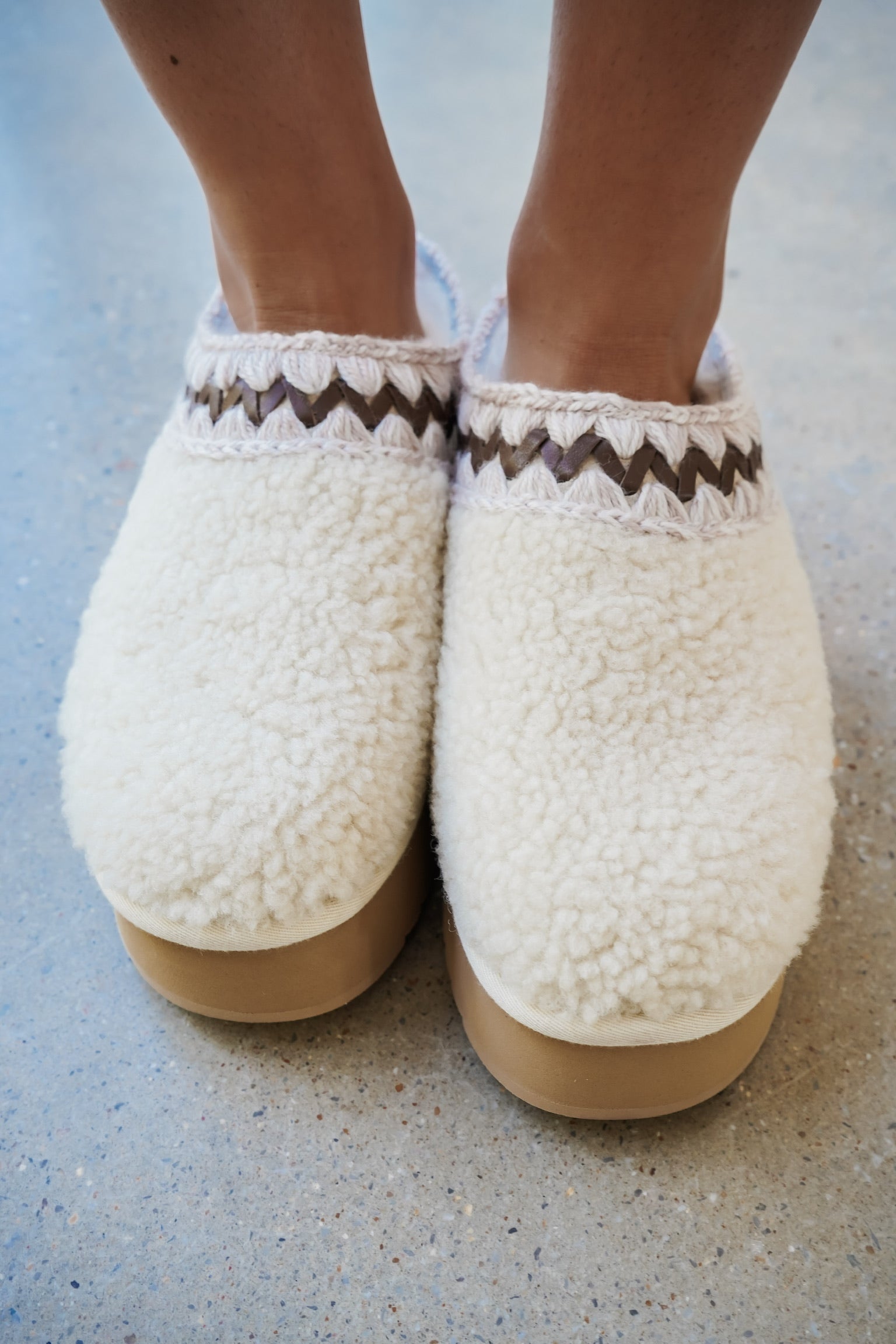 New for FW25, the mou platform clog curly sheepskin is a cosy new addition to our winter collection. This slip-on platform is expertly handcrafted in soft, curly sheepskin with mou trademark hand-crochet wool stitching on the collar. Incredibly comfortable and hard-wearing with rubber EVA sole. Height 4 cm.