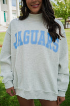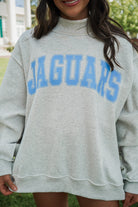 Stay cozy and stylish with this soft, heather grey fleece sweatshirt featuring a high mock neck for extra warmth. Its oversized fit offers comfort and a relaxed vibe, while the varsity-style lettering in JAGUARS on the front adds a chic touch. Flip it inside out to reveal the reversible side with bold woven patch label—two looks in one playful sweatshirt perfect for everyday or lounging around!