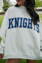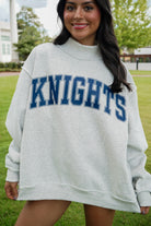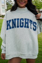 Stay cozy and stylish with this soft, heather grey fleece sweatshirt featuring a high mock neck for extra warmth. Its oversized fit offers comfort and a relaxed vibe, while the varsity-style lettering in KNIGHTS on the front adds a chic touch. Flip it inside out to reveal the reversible side with bold woven patch label—two looks in one playful sweatshirt perfect for everyday or lounging around!