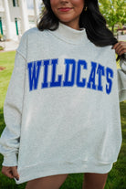 Stay cozy and stylish with this soft, heather grey fleece sweatshirt featuring a high mock neck for extra warmth. Its oversized fit offers comfort and a relaxed vibe, while the varsity-style lettering in WILDCATS on the front adds a chic touch. Flip it inside out to reveal the reversible side with bold woven patch label—two looks in one playful sweatshirt perfect for everyday or lounging around!