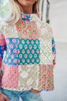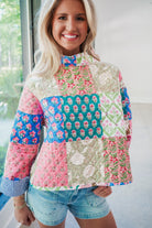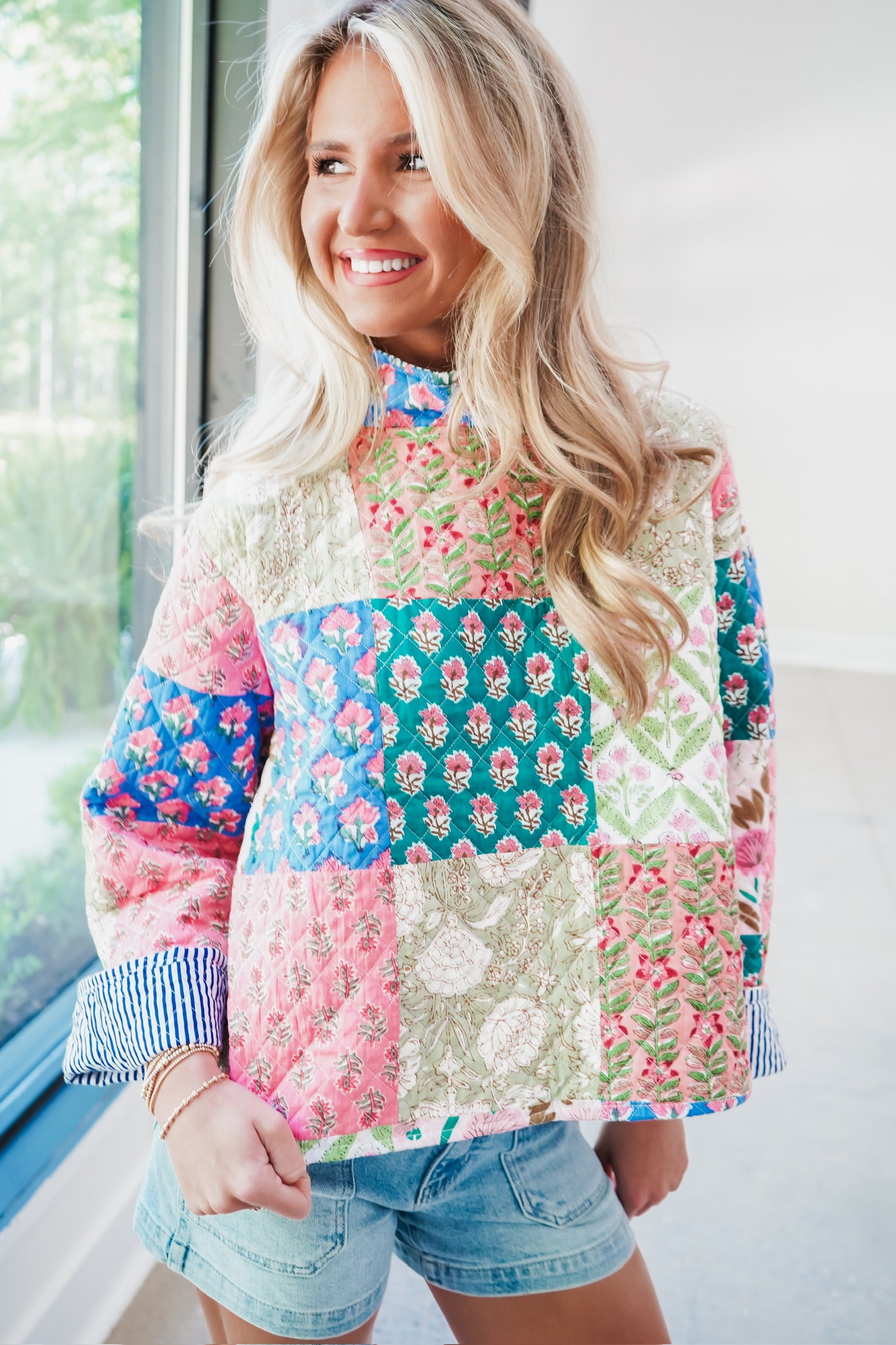 Elevate your everyday style with this quilted mock neck sweater, featuring a stunning floral print on luxuriously textured puff material. The cropped, boxy silhouette offers a modern, relaxed fit that flatters all body types. Flip it inside out to reveal a reversible stripe pattern—two looks in one piece. Perfect for layering or wearing solo, this versatile sweater transitions seamlessly from casual to polished.
