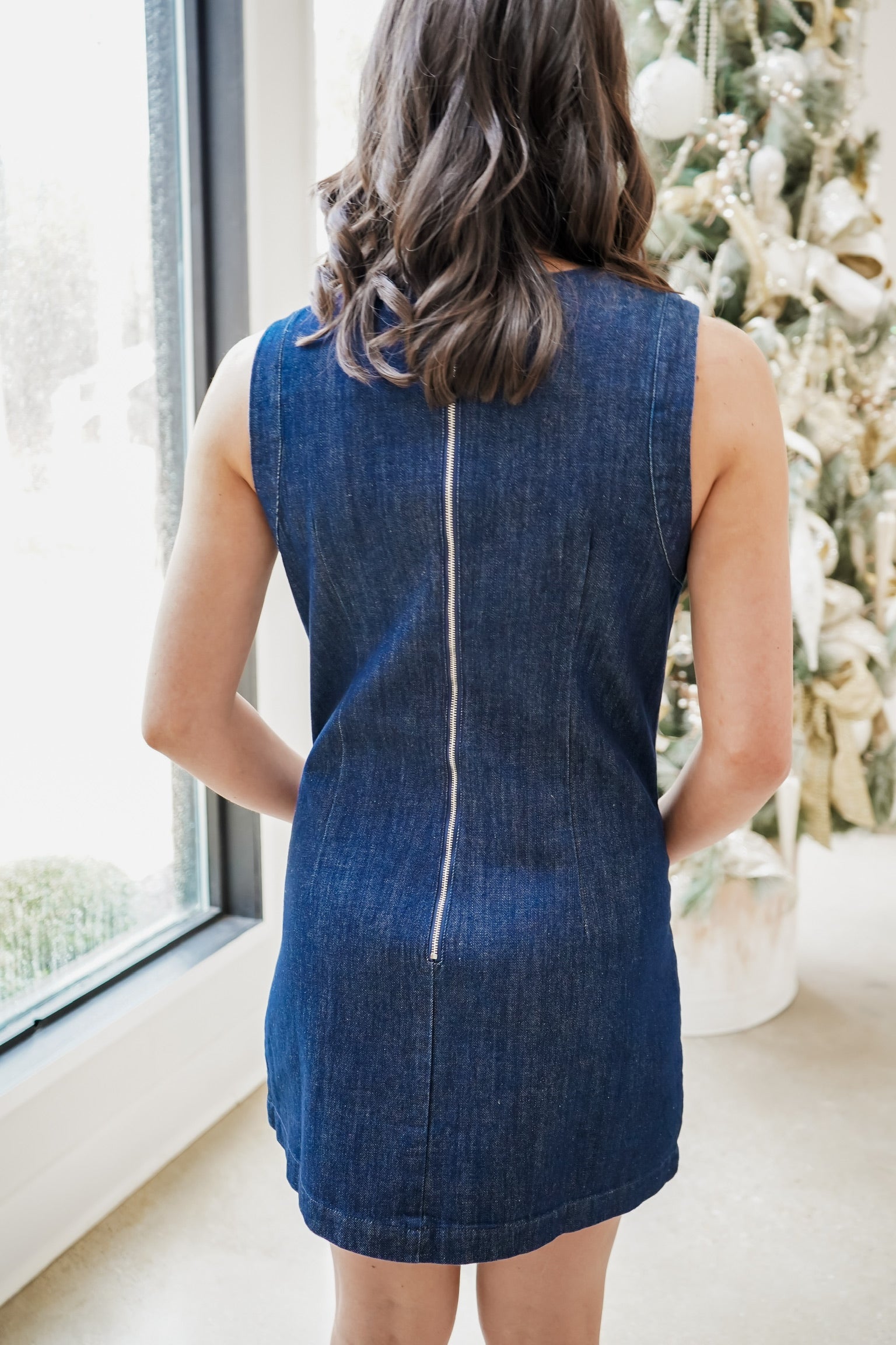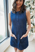 The Rosa Mini Dress is your new go-to for effortless style. This sleek dark denim shift dress features a classic round neckline and a playful mini length that's perfect for any occasion. Practical oversized square pockets on the front keep your essentials close, while a sleek silver back zipper adds a touch of edge. Comfortable, chic, and ready to take you from day to night!