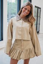 Elevate your style with the Rowan Set, a playful beige denim two-piece that turns heads. The cropped boxy jacket features snap button closure, a suede-like collar, and whimsical balloon sleeves for a fun, flirty vibe. Paired with a matching skirt boasting a drop waist, belt loop waistband, and a charming bubble hem, this set is perfect for making everyday outfits exciting.
