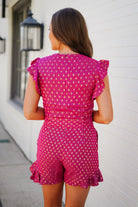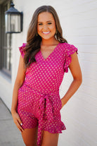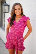 Holiday event ready in this hot pink and gold polka dot shimmer romper with ruffle detail, v-neckline, and tie belt accent. Style with heels for the party look of your dreams!