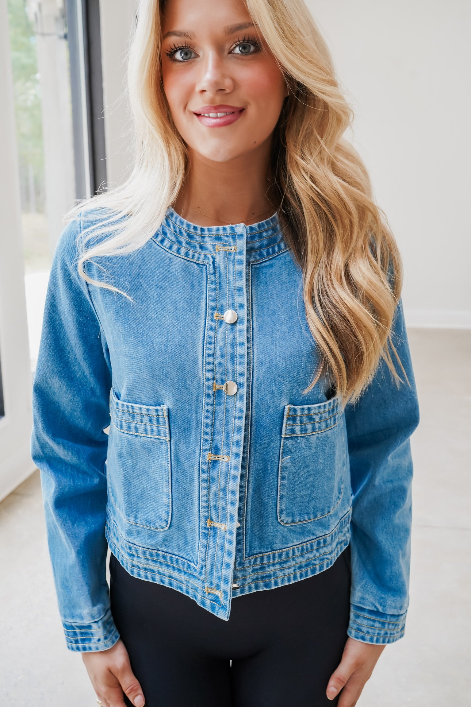 Step into effortless cool with the Sloane Jacket! Crafted from medium denim, it features a tailored fit that highlights your silhouette while keeping things comfy. The collar-less design adds a fresh twist, and front pockets bring both style and functionality. Button it up fully for a polished look that's ready to play all day long!