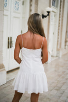 Flirty white mini dress perfect for brides, grads or summer vacations! Spaghetti strap flounce ruffle style with gathered front detail. Style with a heel to complete the look!