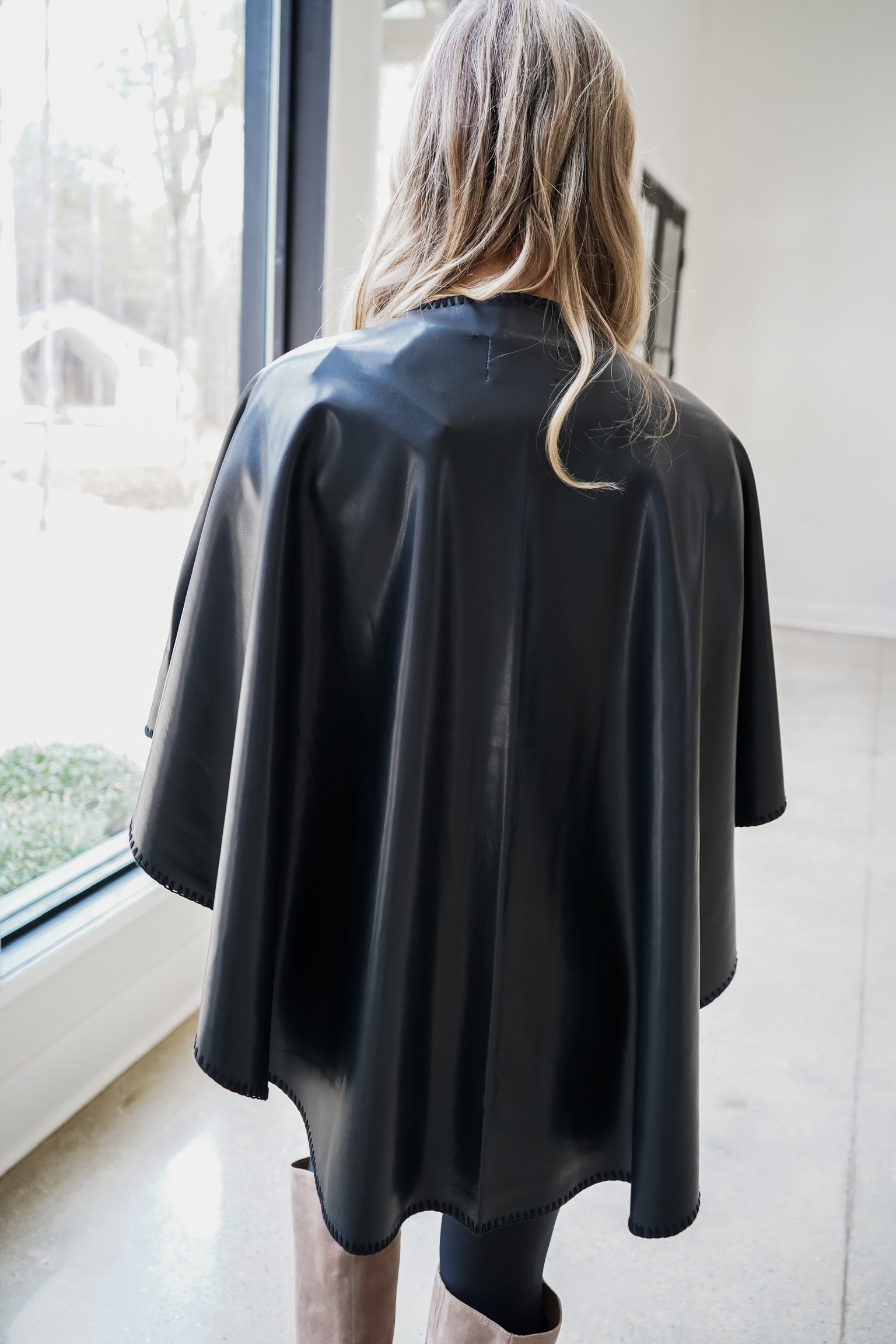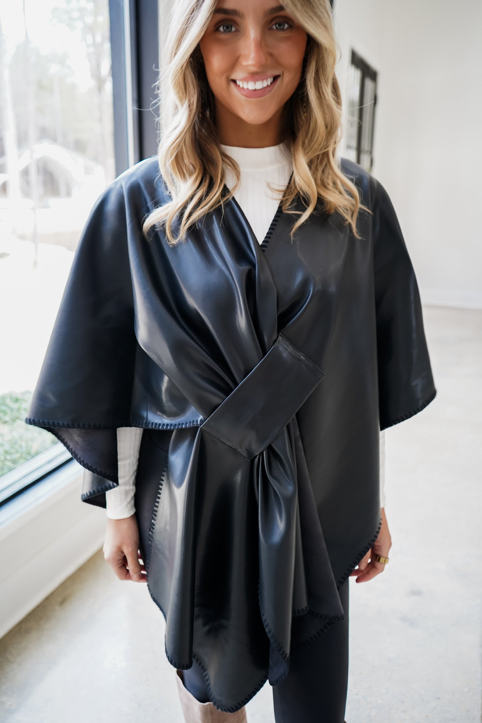 Stay cozy and chic in Dolce Cabo's faux leather wrap, a versatile layering piece perfect for Fall & Winter. Designed with a draped silhouette and soft faux suede lining, this faux leather cape wrap adds warmth and sophistication to any outfit. Pair it with sweaters, tailored pants, or dresses for effortless fall layering and seasonal style.