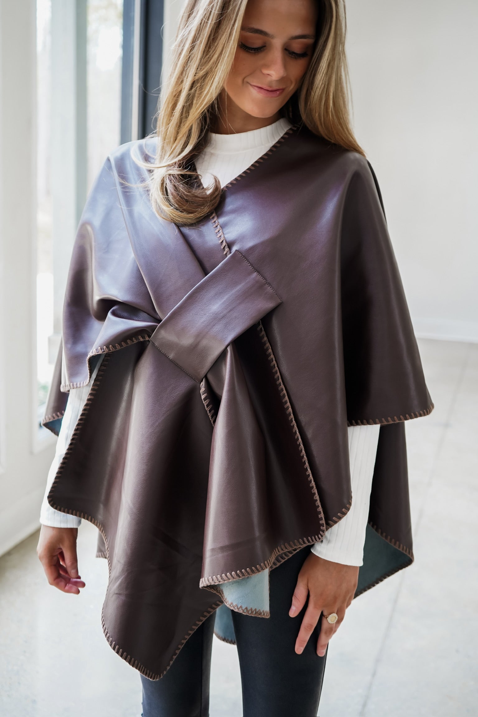 Stay cozy and chic in Dolce Cabo's faux leather wrap, a versatile layering piece perfect for Fall & Winter. Designed with a draped silhouette and soft faux suede lining, this faux leather cape wrap adds warmth and sophistication to any outfit. Pair it with sweaters, tailored pants, or dresses for effortless fall layering and seasonal style.