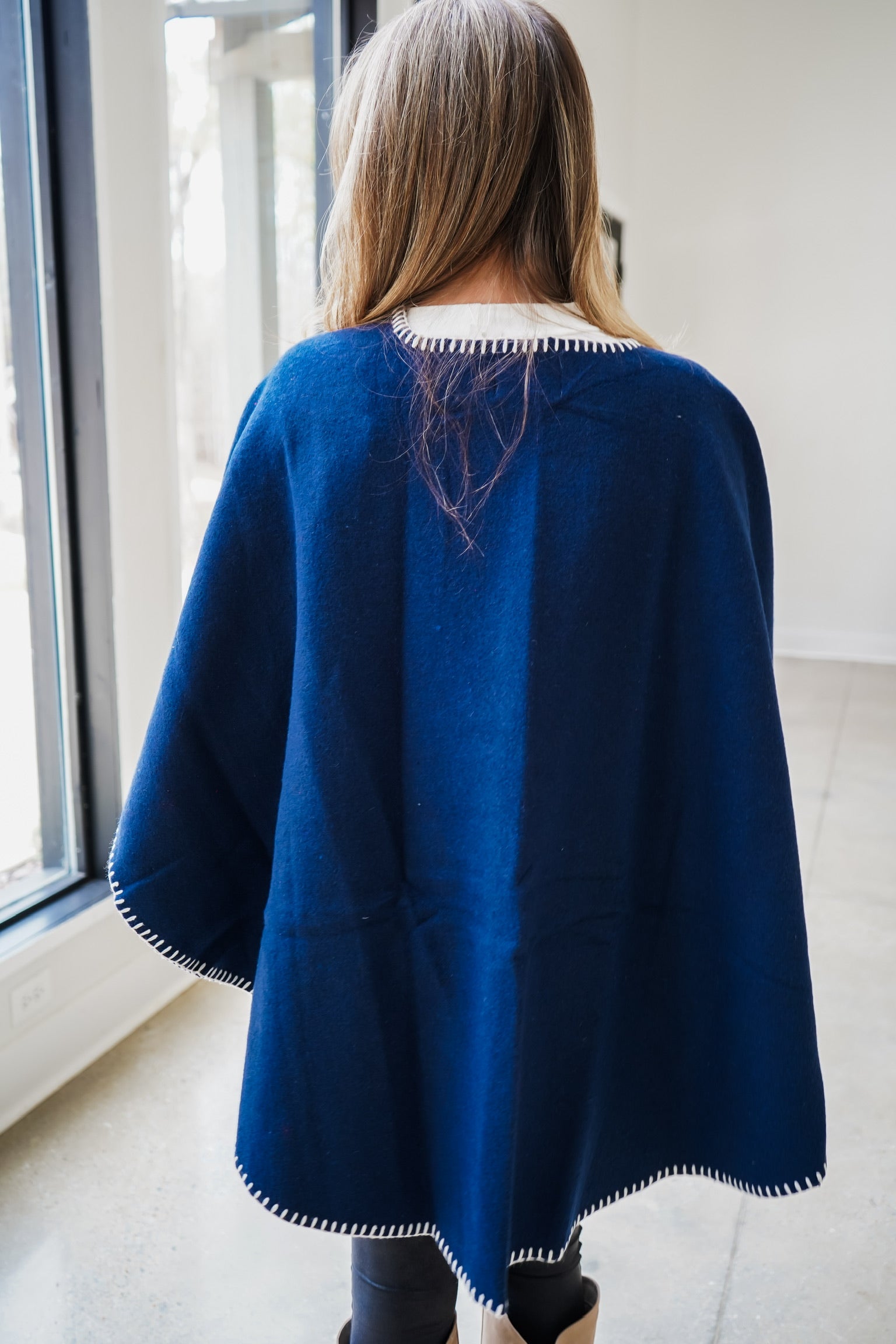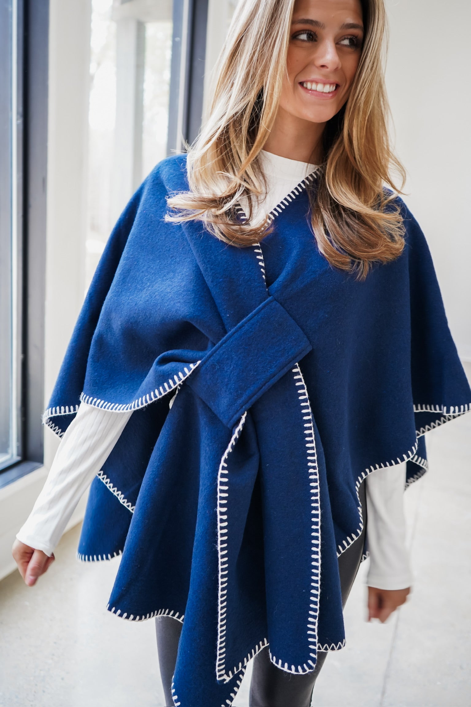 The Whip Stitch Wrap by Dolce Cabo blends timeless elegance with modern ease. Its flowing poncho silhouette is trimmed with striking crème whipstitch edges, creating a refined contrast against the sleek black body. Designed with a belted front for shape and versatility, it layers beautifully over everything from lightweight knits to crisp blouses. Perfect for crisp autumn days, this piece offers both warmth and sophistication, making it a go-to wrap for polished, cozy-chic style all season long.