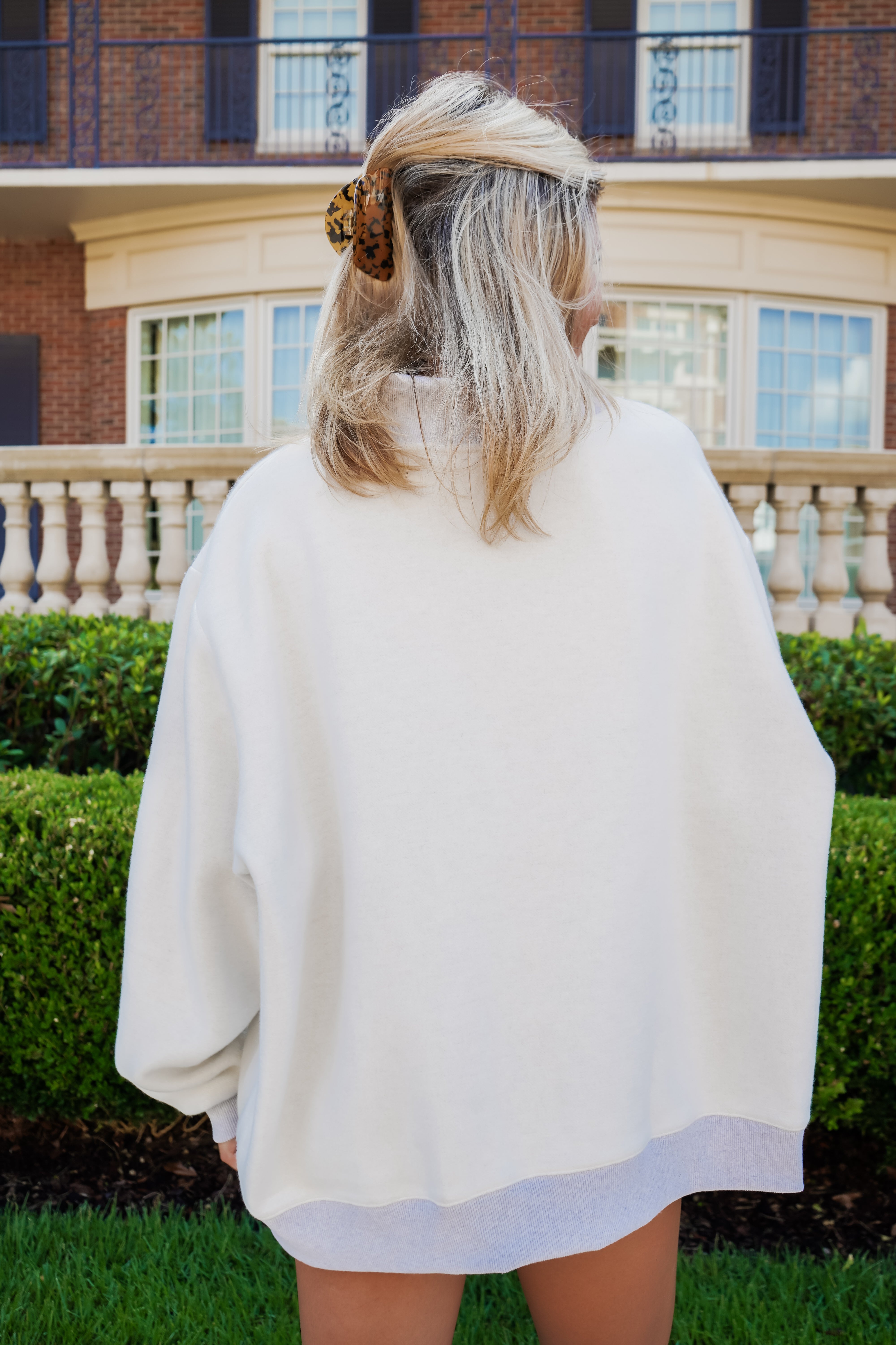 Stay cozy and stylish with this heather grey oversized mock neck sweatshirt, featuring a bold varsity block print on the front in classic sorority colors! Designed for reversible wear, flip it inside out to reveal a sleek contrast rectangle woven patch label for a fresh look. Perfect for showing off your greek pride with a playful twist!