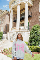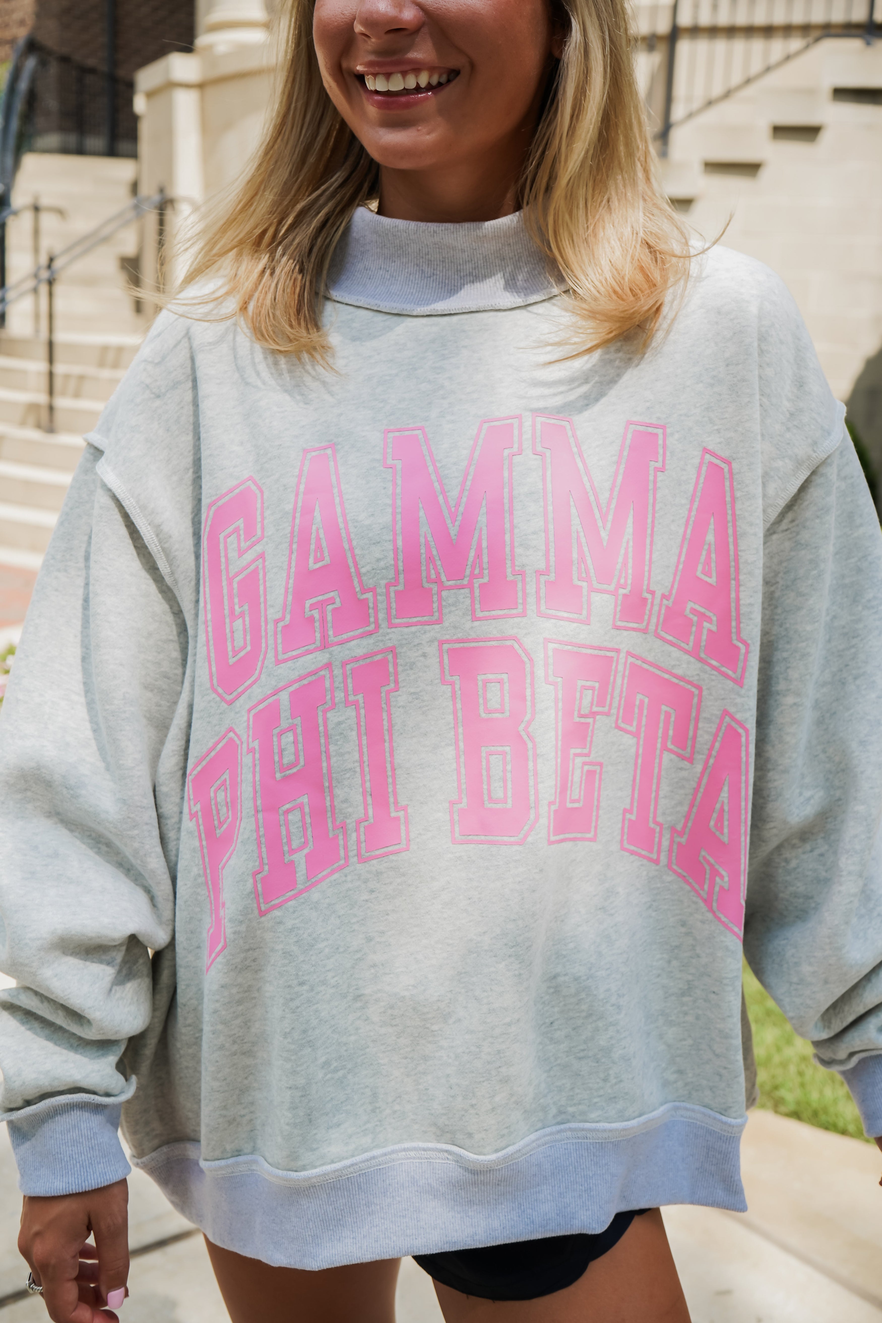 Stay cozy and stylish with this heather grey oversized mock neck sweatshirt, featuring a bold varsity block print on the front in classic sorority colors! Designed for reversible wear, flip it inside out to reveal a sleek contrast rectangle woven patch label for a fresh look. Perfect for showing off your greek pride with a playful twist!