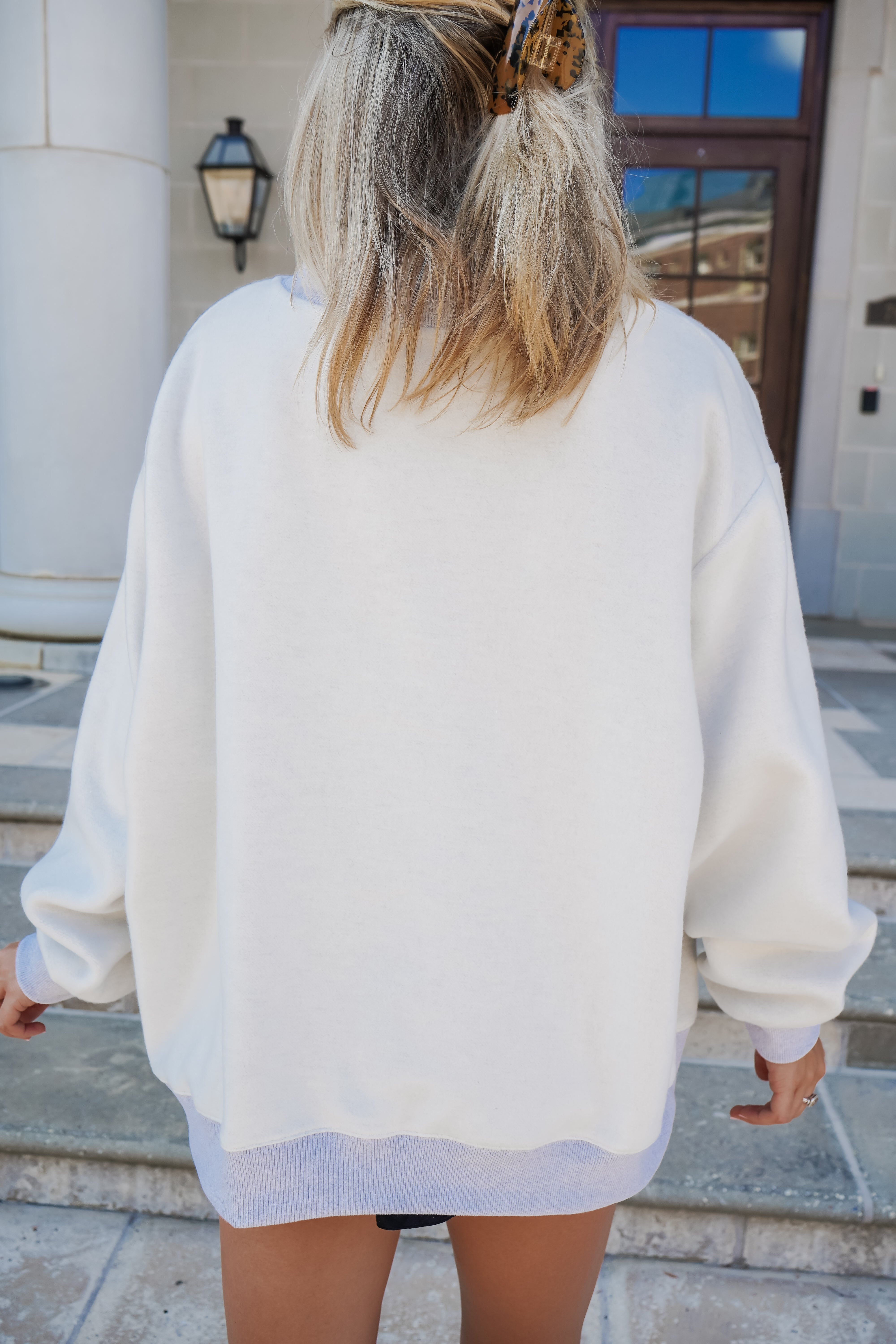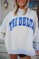 Stay cozy and stylish with this heather grey oversized mock neck sweatshirt, featuring a bold varsity block print on the front in classic sorority colors! Designed for reversible wear, flip it inside out to reveal a sleek contrast rectangle woven patch label for a fresh look. Perfect for showing off your greek pride with a playful twist!