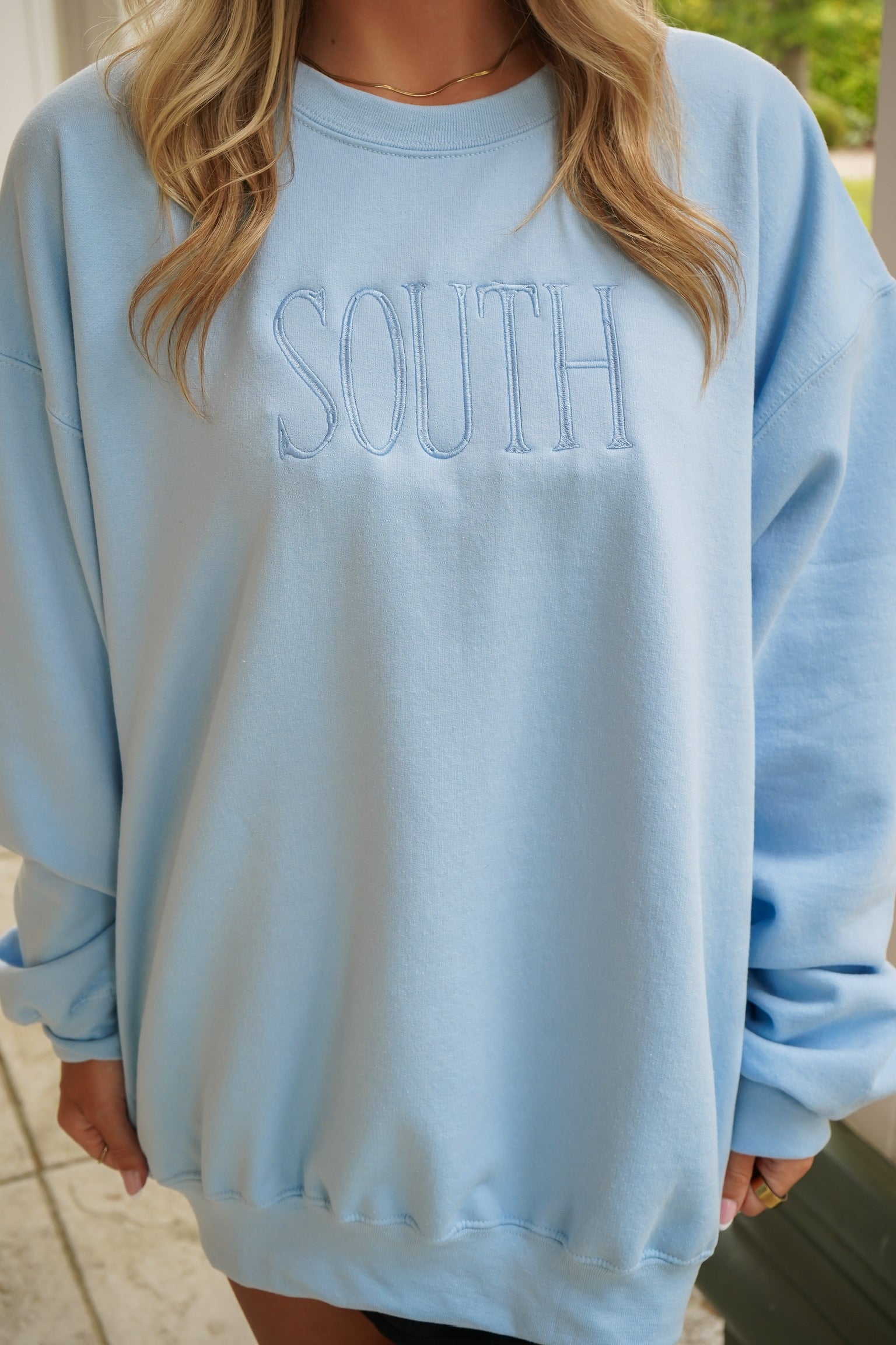 Experience the ultimate comfort and style with our SOUTH Sweatshirt in baby blue! Made from premium materials, this custom crewneck sweatshirt features a beautifully embroidered block font with our signature "SOUTH" to represent our unique style and individuality. Stay cozy and chic all day long in this one-of-a-kind piece!