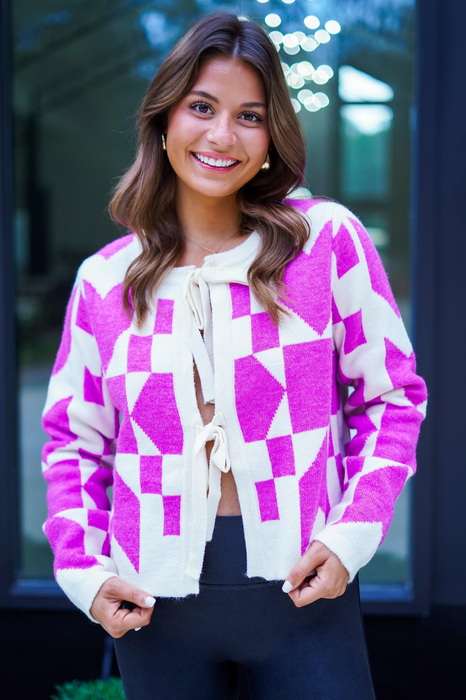 Indulge in the cozy comfort and effortless style of our Yasmine Sweater! This cream checkered cardigan boasts a charming double bow front closure for a touch of elegance. Perfect for chilly days, it's the ultimate statement piece for any fashion enthusiast. Take your wardrobe to the next level with this must-have sweater!