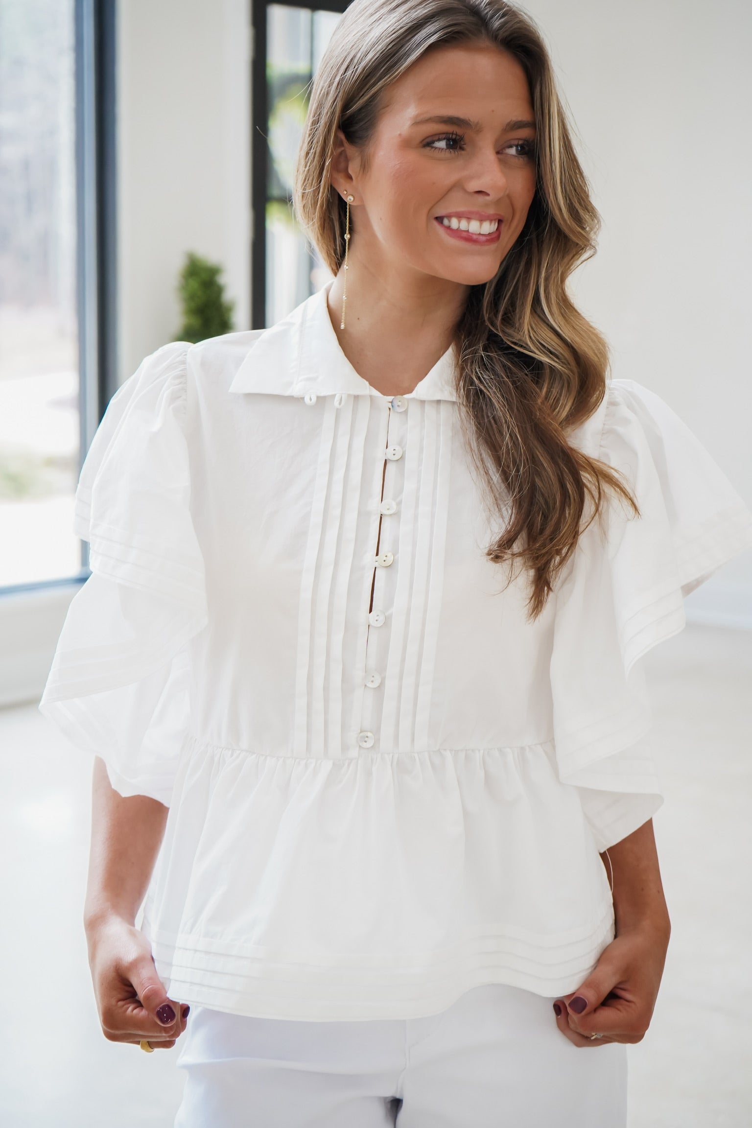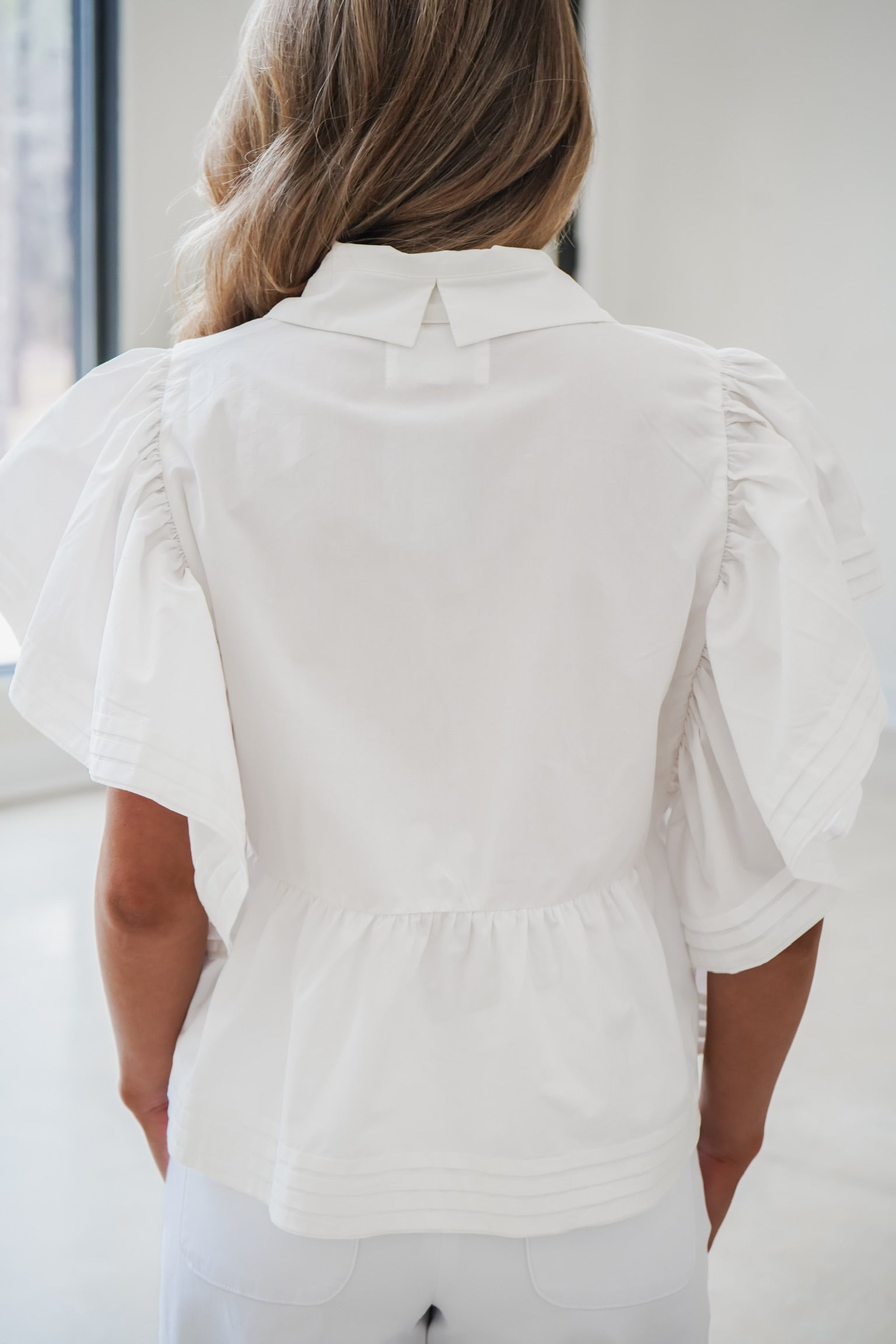 Elevate your wardrobe with the Genesis Top! This expertly crafted blouse features delicate pintuck detailing that adds sophisticated texture, while ruffled sleeves bring contemporary flair. The peplum silhouette creates a flattering, feminine shape, and the front button closure allows for effortless styling versatility. Perfect as a standalone piece or layered under jackets, this crop top transitions seamlessly from casual to polished occasions.
