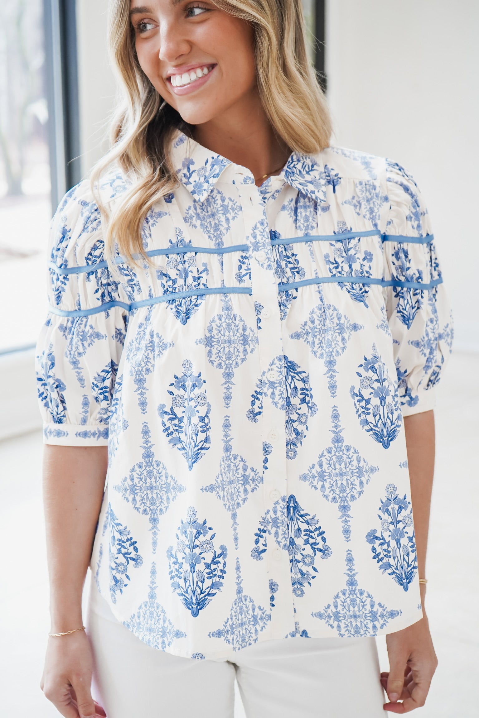 The Heath Top combines timeless sophistication with contemporary ease. This blue floral printed button-down features delicate puff sleeves that add dimension and charm, while the structured fit ensures a polished silhouette. The classic stripe pattern offers versatility—dress it up with tailored trousers or down with denim for effortless style. Premium construction and quality fabrics make this a wardrobe essential that transitions seamlessly from office to weekend wear.