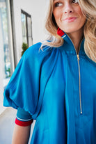 Brighten your wardrobe with the Jackie Top, featuring playful color block puff sleeves and a contrasting ribbed mock neck collar. The zip-up front adds a modern edge, while the flowy silhouette lets you move with ease and style. Perfect for turning heads with a fun and fresh look!