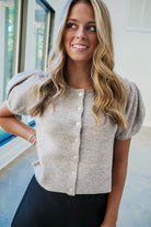 Bring a fun twist to your wardrobe with the Stacy Top. Featuring playful puff short sleeves and a classic crew neck, this button-down knit top combines comfort with flair. Perfect for layering or wearing on its own, it adds a sweet, stylish touch to any outfit. Embrace easygoing charm with a hint of sophistication in this must-have closet favorite.