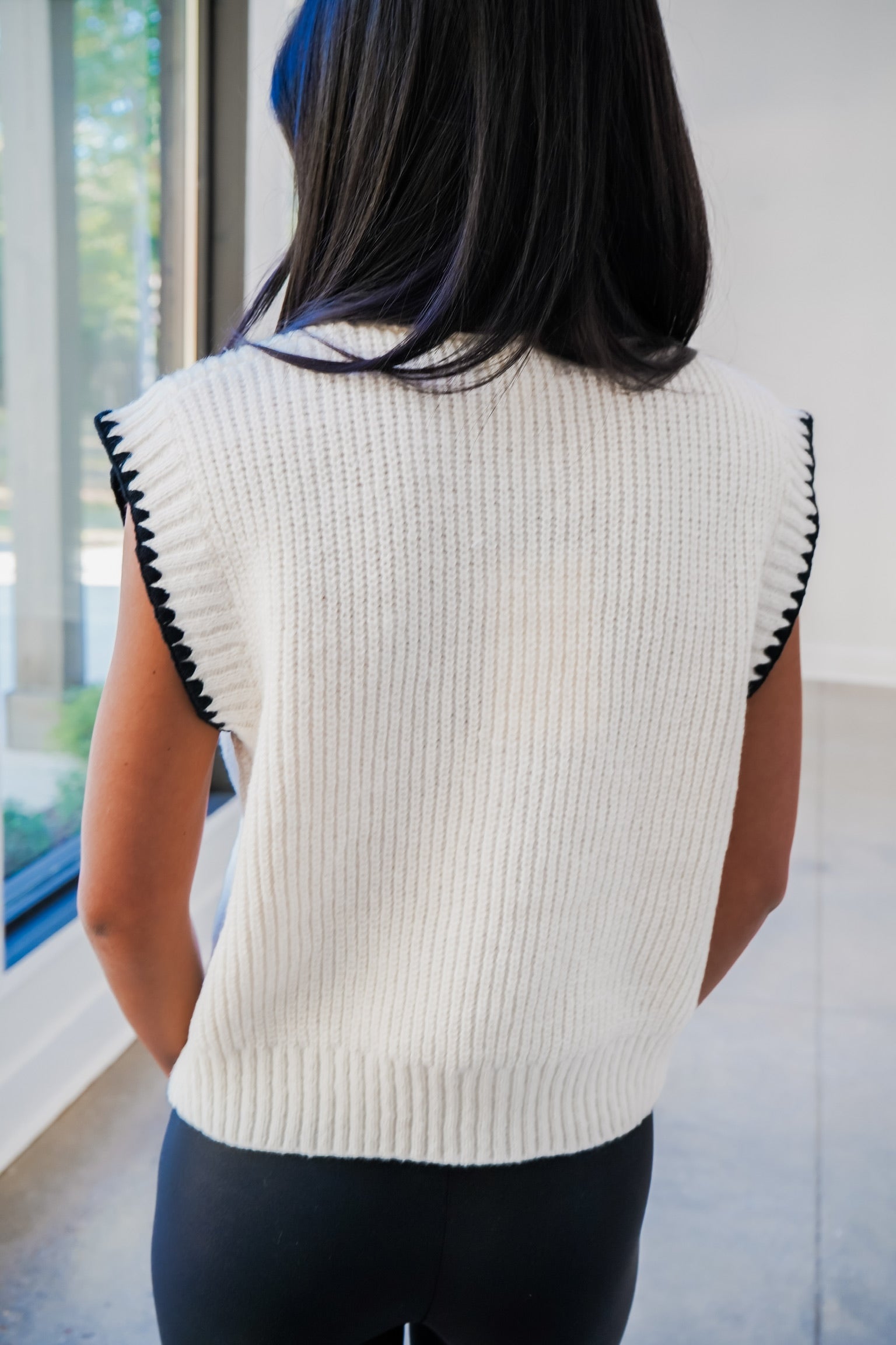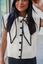 The Worth Sweater Top is a playful twist on classic knitwear. Featuring a tie neck and sleeveless design, this sweater vest flaunts charming contrast trim and blanket stitch details that add a cozy, handmade feel. The front button closure not only makes it easy to wear but also adds a cute, vintage-inspired touch. Perfect for layering or wearing solo, it’s a fun way to brighten up any outfit with a dash of personality!
