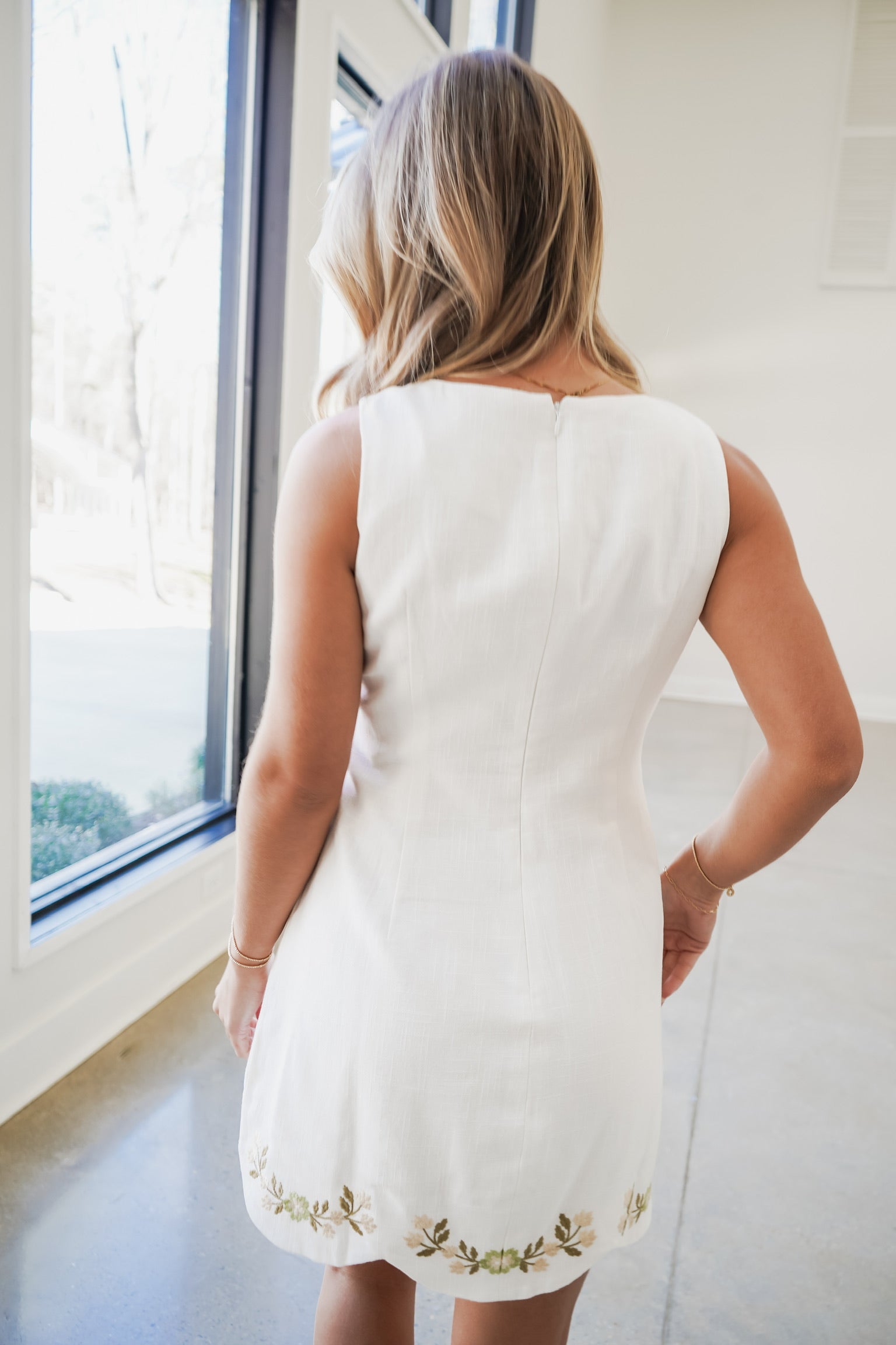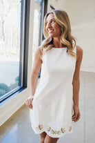 The Darla Mini Dress combines effortless elegance with playful charm. This white sleeveless design features a delicate scallop hem that adds a feminine touch, while vibrant green embroidered flowers bring personality and movement to every wear. Perfect for warm-weather occasions, from casual outings to garden parties, this versatile piece transitions seamlessly from day to night. The lightweight construction keeps you cool and comfortable, while the intricate floral embroidery makes a sophisticated statement without overwhelming your look. Elevate your seasonal wardrobe with a dress that balances timeless style with contemporary flair!
