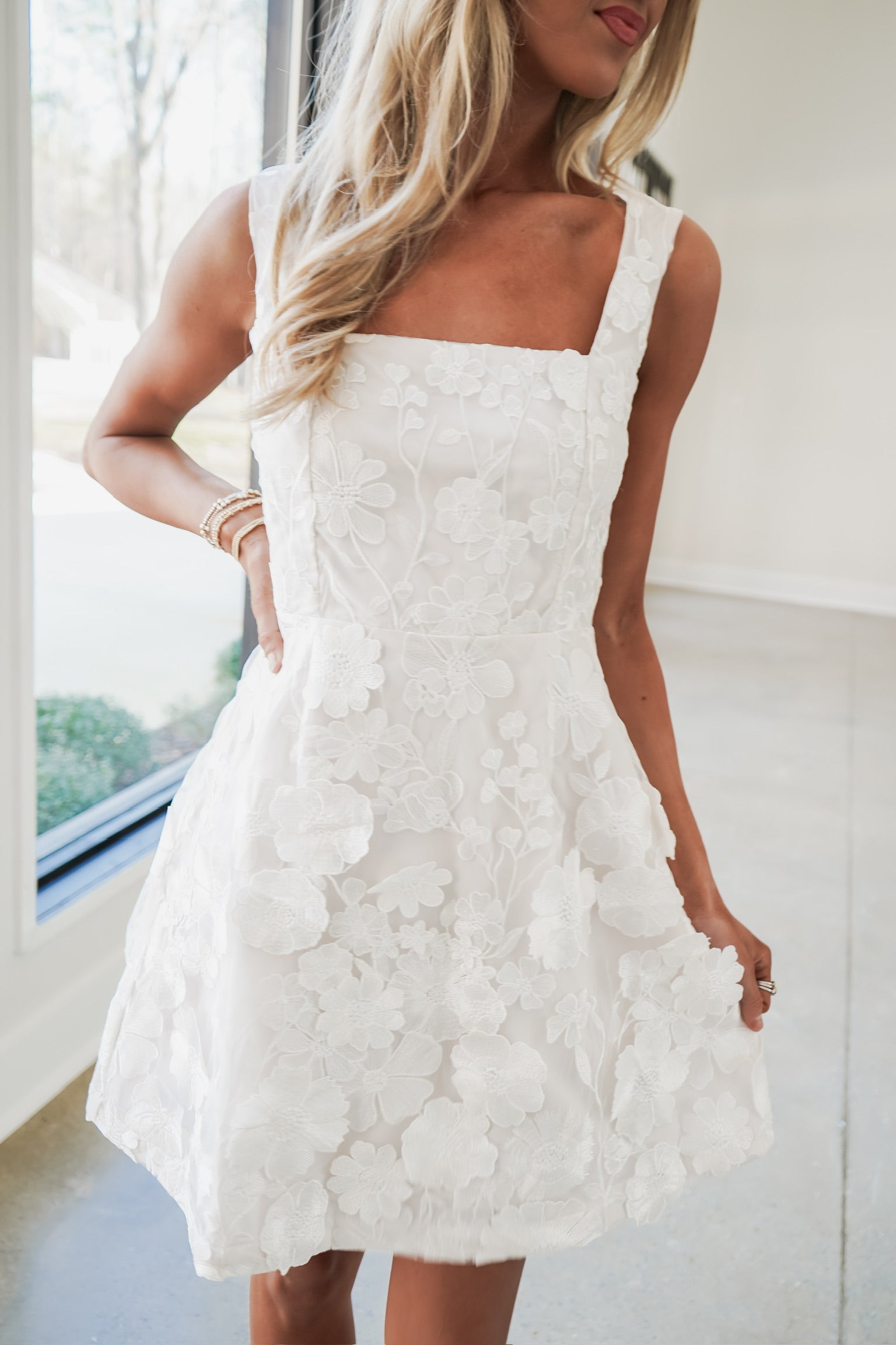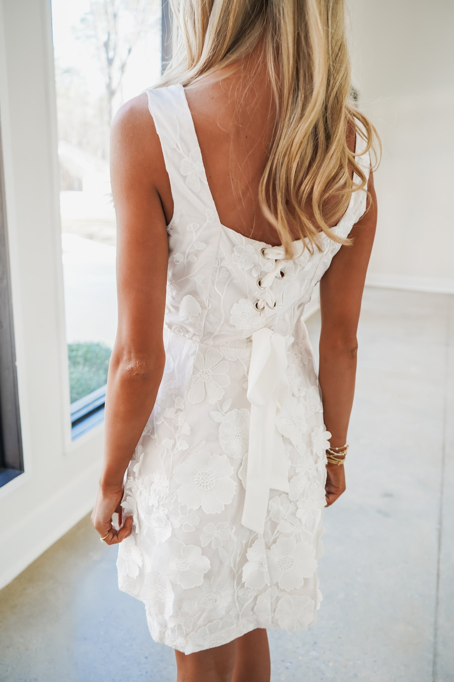 Elevate your evening look with the James Mini Dress, a stunning cream sleeveless design featuring bold wide shoulder straps and a chic square neckline. The open back showcases an elegant wide satin bow corset strap closure, while intricate 3D flower applique details add dimension and sophistication. Perfect for special occasions or nights out, this dress combines modern elegance with romantic touches.