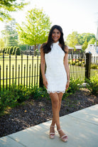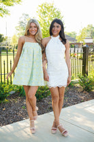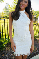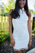 Embody effortless elegance in our Kaelyn Mini Dress! The white mesh overlay, jacquard floral print, and embroidered halter style neckline exude femininity. The fitted, sleeveless, and strapless design highlights your curves while the open back adds a touch of allure. Perfect for any occasion, this dress is a must-have for every fashion-forward individual.
