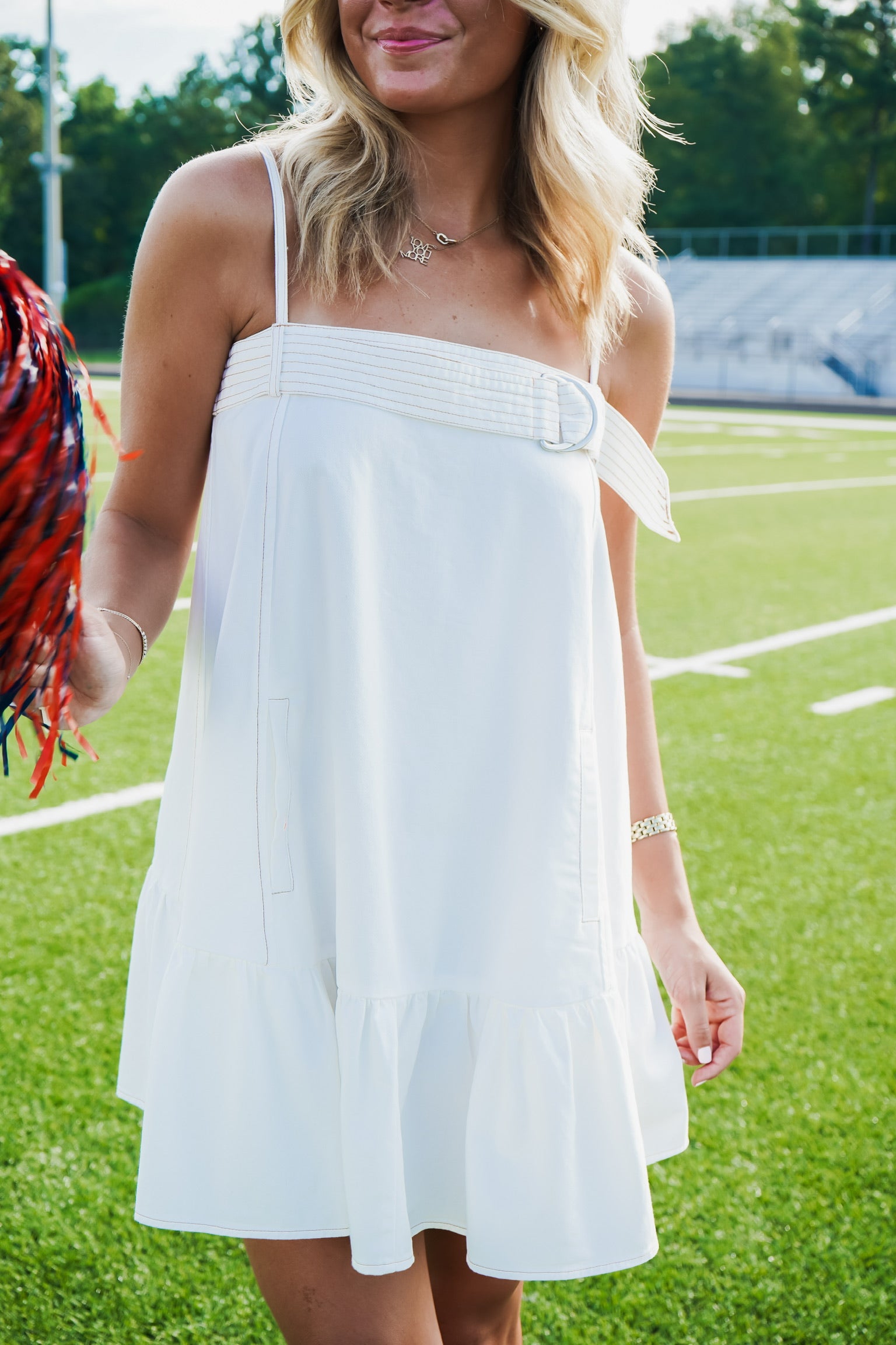 Turn heads in the Lunden Mini Dress, featuring playful contrast tan stitching and a flirty ruffle skirt hem. This sleeveless shift dress has a belted bodice and buckle closure, adding a fun, edgy touch to your look. Perfect for sunny days and casual nights out!