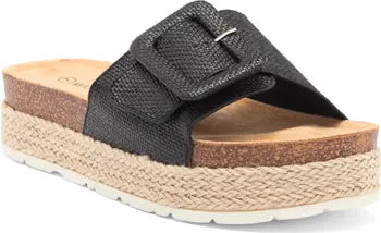 Elevate your resort look with the laid-back charm of this platform slide sandal featuring a cork-cushioned footbed, braided jute wrap and a bold oversized buckle on top.