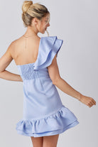 Turn heads in the Amanda Dress, a fun and flirty mini featuring a playful one-shoulder ruffle that adds a touch of whimsy. Its vibrant blue hue makes it perfect for day or night, while the ruffle detail creates movement and charm. Effortlessly stylish and ready for any occasion, this dress brings out your playful side with every step.