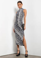 Enjoy the flattering, elegant look created by our Arden Dress. Featuring a fitted sleeveless bodice with a high-neck collar and a form-fitting skirt with intricate slit on the side.
