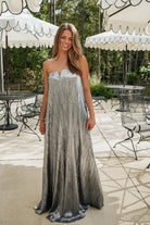 Meet Athena, your go-to for party season! This perfectly draped gown in dreamy pleated silver fabric features a notched strapless neckline and flows like liquid silver - equal parts dreamy and dramatic!