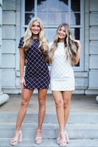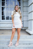 Unleash your inner diva with the Ava Dress! This stunning round neck bodycon mini dress features short sleeves and a rhinestone quilted jewel pattern that will catch everyone's eye. The solid black back panel adds a touch of elegance to this statement piece. Get ready to dazzle in style!