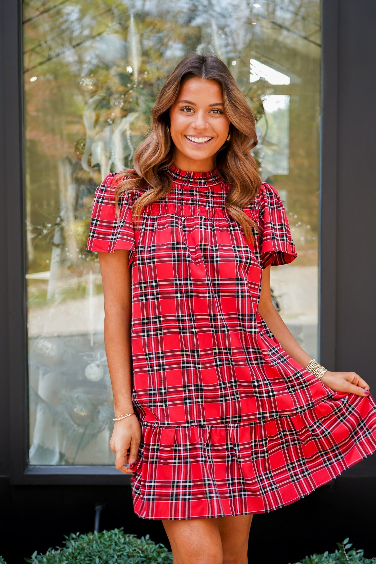 Get ready to turn heads in the Boswell Mini Dress! This red tartan plaid dress features flutter short sleeves and a smocked panel that leads to a mock neck for a unique look. The mini hem and looser fit make it perfect for a night out!
